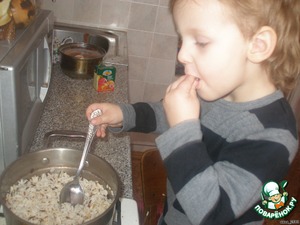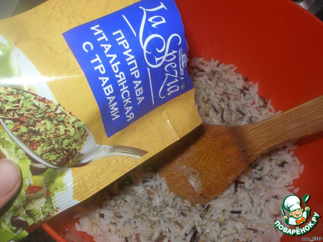 Отварила в подсоленной воде смесь риса до полуготовности (на пачке время приготовления было 35 минут, я варила, примерно, 17-20). Помешивал и снимал пробу сынуля.