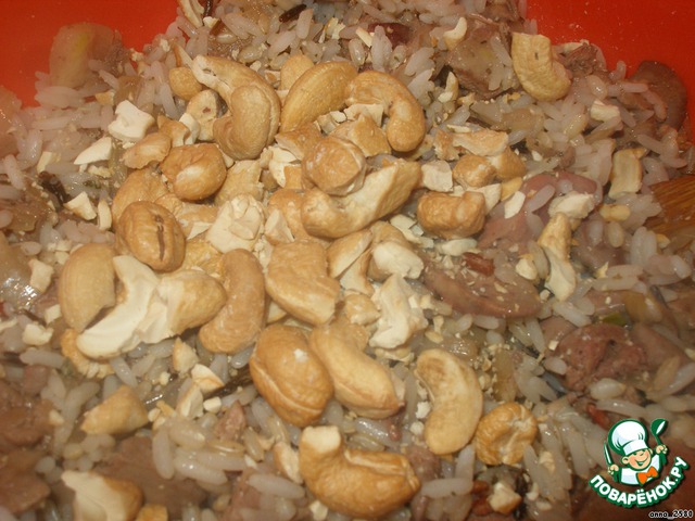 Теперь смешала все ингредиенты начинки: рис, печень с луком и орехи кешью. Часть орехов можно раздавить, а часть оставить целыми.