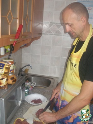 Затем Олег нарезал куриную печенку небольшими кусочками и измельчил лук.