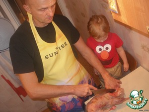 Подготовить гуся - выпотрошить, опалить, промыть. Это ответственное задание я доверила мужу. Сын наблюдал за процессом и постоянно пытался "помочь"! Затем я хорошо смазала гуся оливковым маслом, натерла солью и перцем и отложила "в сторонку", примерно, на пол дня.
