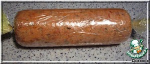 Положить по середине трубку, обернутую фольгой, и обвернуть вокруг нее фарш с помощью пленки.