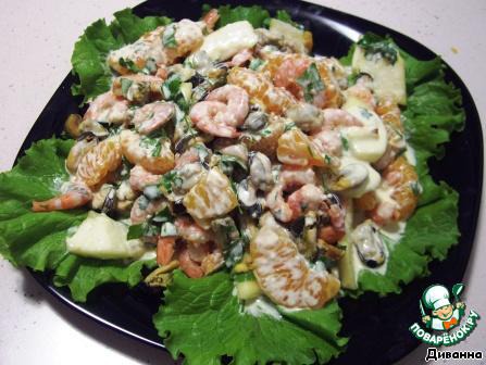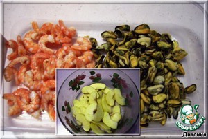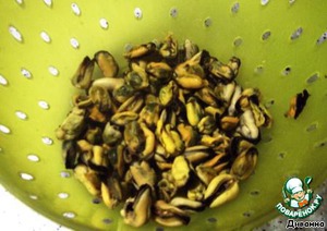Отвариваем в подсоленной воде мидии. Доводим до кипения и 1-2 мин. провариваем. Сливаем, остужаем.