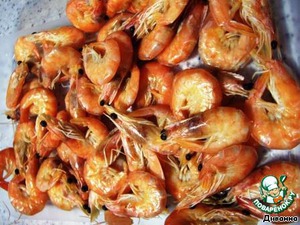 Креветки отвариваем в подсоленной воде с уксусом. Довести до кипения и проварить 1-2 мин. Сливаем, очищаем.
