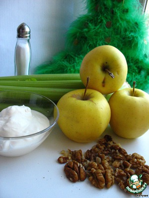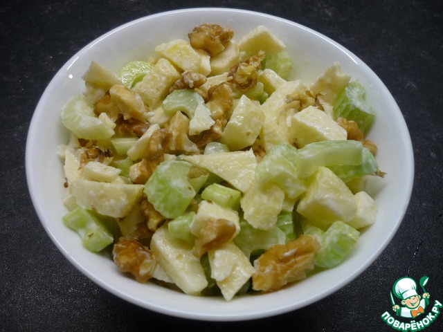 Яблоки нарезать кубиком, сельдерей тонкими кусочками, орехи порубить.