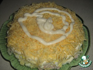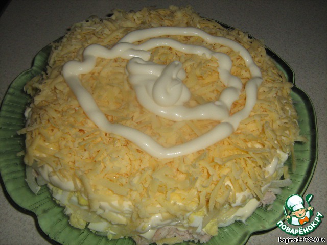Сыр (у меня "Российский") натрем на крупной терке, выложим на яйца и смажем майонезом.