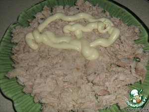 Теперь собираем салат: куриное мясо мелко нарежем и смажем майонезом.