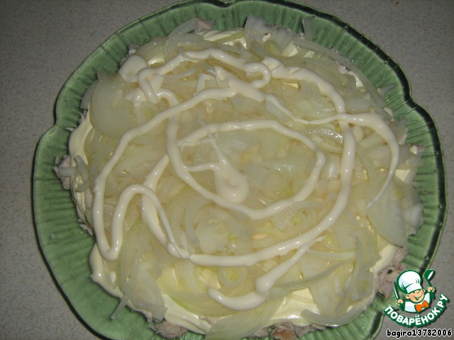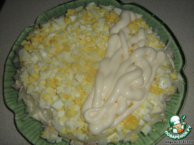 Яйца мелко нарежем, выложим на лук и промажем майонезом.