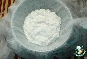 Берем кастрюлю, кладем сито, на нее марлю в два слоя, и выкладываем зернистый творог.