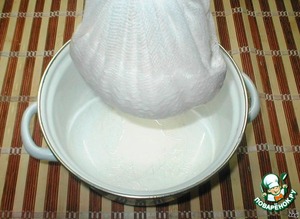 Завязываем марлю узлом и подвешиваем, чтобы стекала жидкость-сыворотка. На сутки, не меньше.