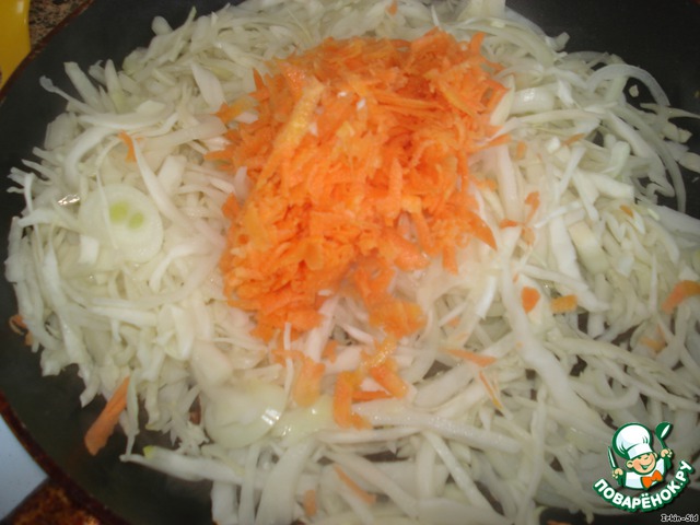 Затем капусту, лук и морковь нашинковать/нарезать /натереть на терке, соответственно. Отправить овощи на сковороду. Присолить, чтобы дали сок. Тушить, не накрывая крышкой, чтобы жидкость немного выпарилась.