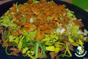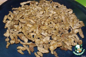 Мясо нарезаем соломкой и обжариваем на растительном масле. Солим и перчим - по вкусу. Добавляем 1 ст. ложку бальзамического уксуса.