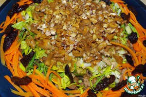 Первым слоем выкладываем мясо. Каждый слой слегка поливаем заправкой.