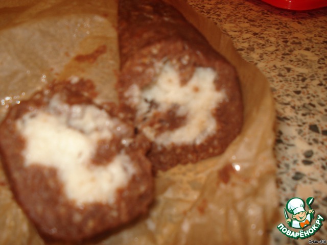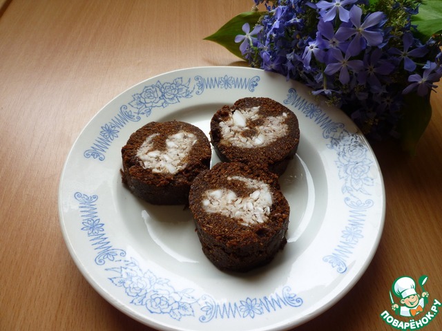 Шоколадный сироп добавляем понемногу к сухарям, разминаем, чтобы получилась густая смесь. Эту смесь мы распределяем на пергаменте, сверху размазываем кашицу из кокосовой стружки, сворачиваем при помощи пергамента в рулет, в этот же пергамент и заворачиваем сам рулет.