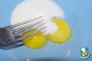Яйца разделить на белки и желтки. Желтки смешать с 1,5 столовой ложки сахара.