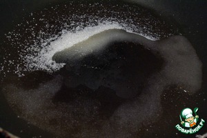 Для карамели, на сковородку высыпаем оставшийся сахар, добавляем 1 ст. ложку воды. Готовим до образования карамели. Здесь всё на Ваше усмотрение. Я хотела ароматную карамель, потому довела её до слегка коричневого цвета.