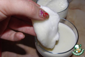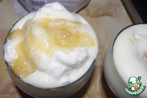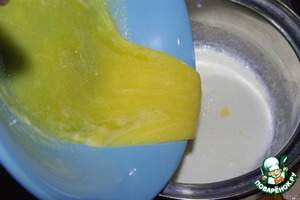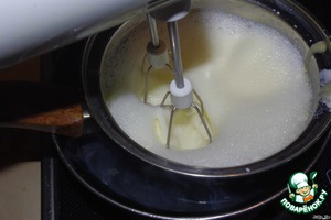 На водяной бане, постоянно взбивая миксером, держать молочно-желтковую смесь до тех пор, пока она не увеличится в объёме в три раза (она просто будет "выпрыгивать" из миски или кастрюльки).