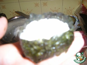 Выкладываем на матрасик лист нори, половину его заполняем рисом.