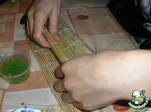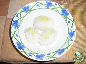 Теперь из риса лепим эллипсы, смазываем васаби.