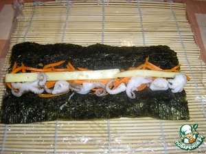Нарезаем рыбу, сыр, огурец, отваренных молодых осьминогов - тонкой соломкой.