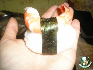 Сверху выкладываем креветку и закрепляем её тонкой полоской нори.