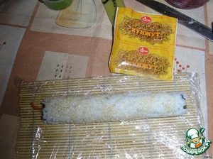 Теперь делаем ролл рисом наружу. Рис на лист нори выкладываем по всей поверхности, исключая полоску у края примерно 1 см.