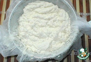 Как только сыворотка стечет (на ней можно приготовить блины), выкладываем сырную массу (она должна быть слегка теплой).