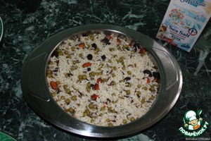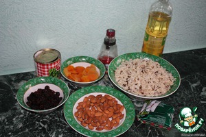 • 3. в отварной рис добавим зеленый горошек, изюм и миндаль, немного присолим,