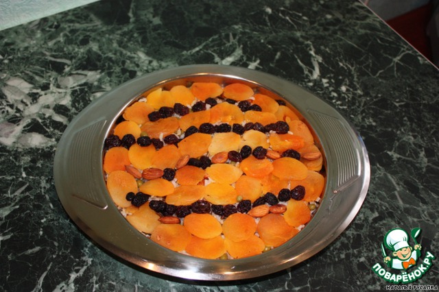 • 4. украшаем нарезанной пополам курагой, изюмом и миндалем, сделав из них тигровые полоски.
