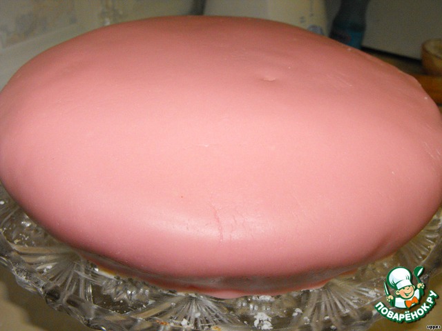 Из мастики раскатала пласт, превышающий размер бисквита. И аккуратно переложила на торт, приглаживая. Лишнее отрезала ножом.