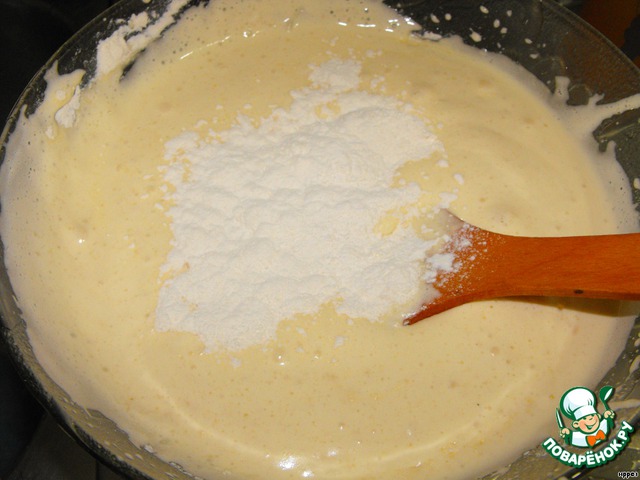 Просеянную муку смешать с разрыхлителем и ванилью и, добавляя понемногу, смешать с яичной массой, перемешивая лопаточкой снизу вверх по кругу.
