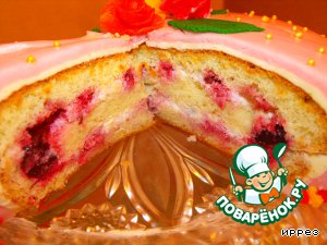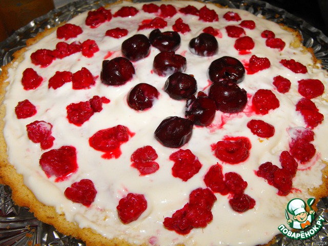 Корж пропитать соком из ягод, смазать сметанным кремом, выложить вишню и малину. Накрыть вторым коржом, также смазать кремом, выложить ягоды. Накрыть третьим коржом.