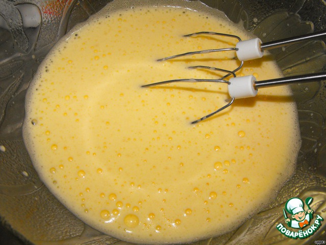 Яйца хорошо взбить до увеличения объема в 3 раза /минут 8/.
