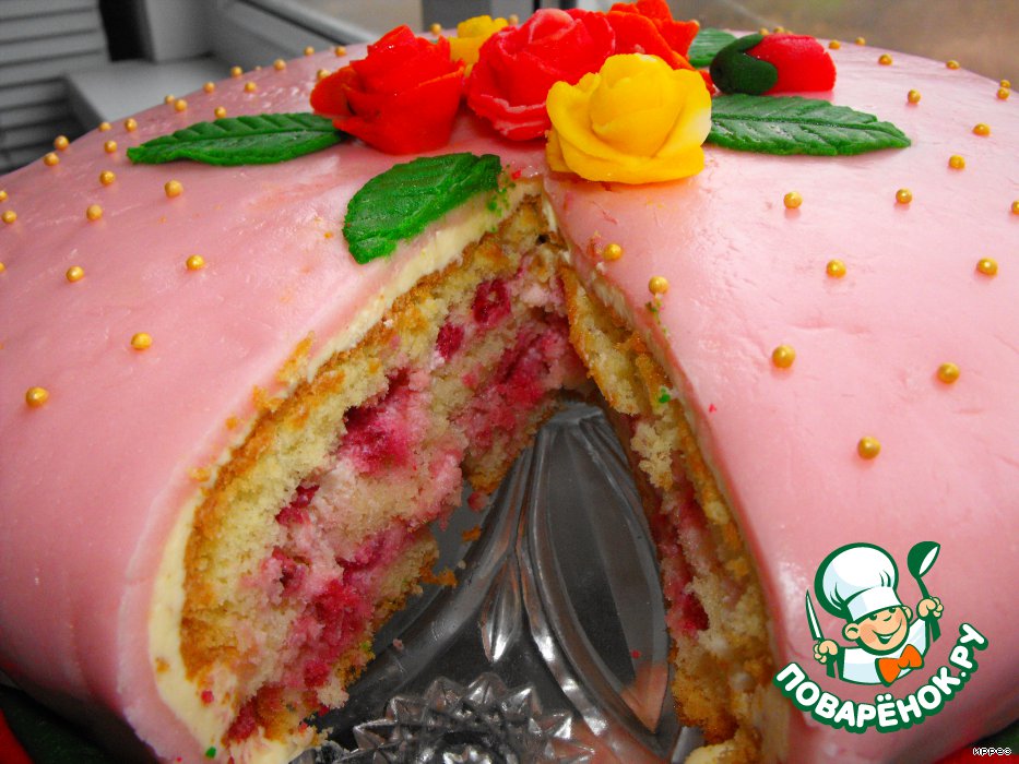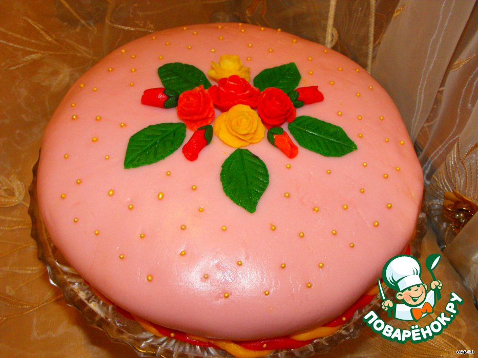 Это мой 100 -ый рецепт. Поэтому решила, что будет тортик!!! Нежный, ванильный бисквит со сметанным кремом и ягодами, спрятанный под мастикой! Всегда хотела научиться украшать торты. Это мой первый эксперимент. Буду рада, если Вам понравится! И надеюсь, что Вы приготовите (мастику берем не в счет)!!! Рекомендую!!! Бисквит - сказочный, позаимствовала у своей подруги Натальи с Кулинара.