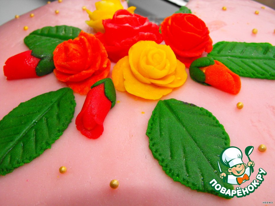 Для украшения я использовала зефирную мастику, собственноручно-приг отовленную. Из которой сделала вот такие розочки.