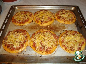 Подошедшее тесто раскатать в любую форму, какая вам только нравится - это может быть и большой круг, и прямоугольник или как у меня - несколько небольших кругов. Тесто сильно тонко раскатывать не стоит. У меня из такого количества продуктов получается, примерно, 7 шт. средних пицц. Выложить начинку, разровнять. Посыпать сыром, натертым на крупной терке. Сбрызнуть оливковым или подсолнечным маслом, чтобы сыр не был сухим. Я еще посыпаю приправой для пиццы, в магазине продается.