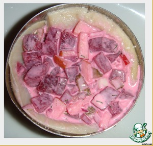 Смешать овощи и заправить их смесью из густой сметаны, сока лимона и майонеза. В соус можно добавить нарезанный укроп. Соус не должен быть жидким, иначе он будет вытекать из-под кольца. Плотно заполнить отверстие кольца.