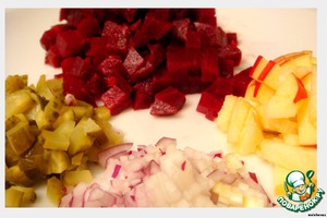 Очень мелкими кубиками нарезать лук, свеклу, огурцы и яблоко.