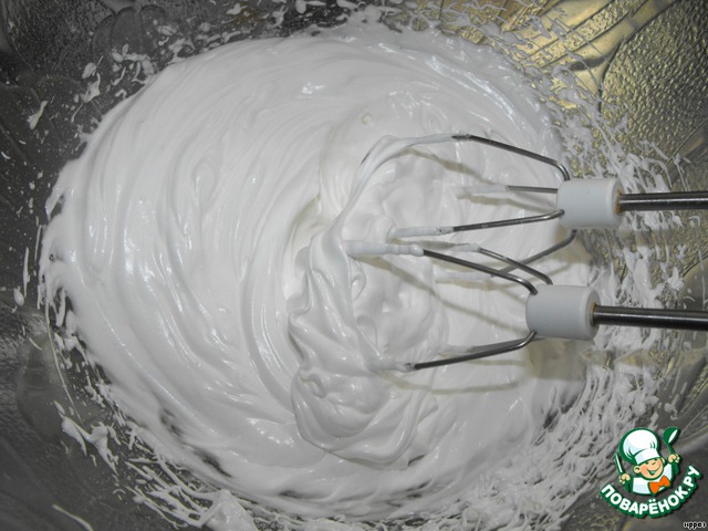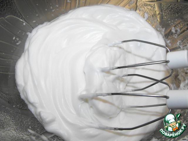 • Затем добавить в 3-4 приема сахарную пудру, продолжая взбивать до крепких пиков.