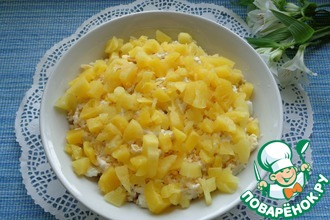 Ананасы нарезаем кусочками. Курицу - мелкими кубиками.