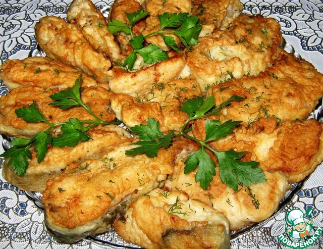 • Обмакиваем каждый кусочек в кляре и выкладываем на разогретую сковороду с маслом. Обжариваем с двух сторон.