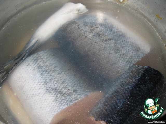 Заливаем кипятком рыбку и варим до полной готовности. Косточки должны сами отходит от мяса.