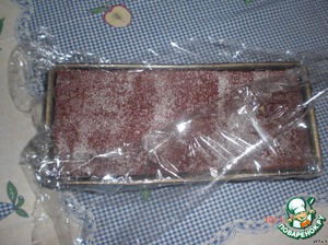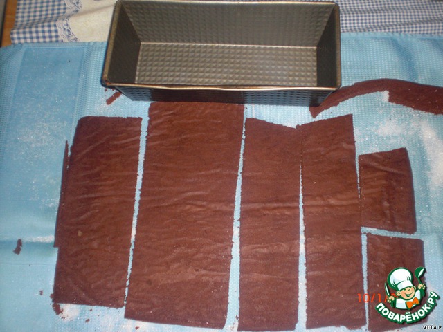 Готовый корж аккуратно выложить на полотенце посыпанное сахаром и снять бумагу. Дать остыть и порезать на куски по размеру формы (форма размерами 23*7,5 см и 7 см. в высоту).