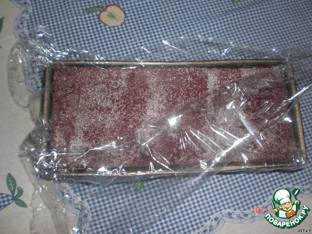Накрываем последним кусочком, потом плёнкой и помещаем в холодильник на 4 часа.