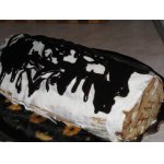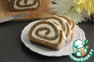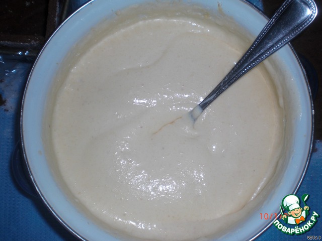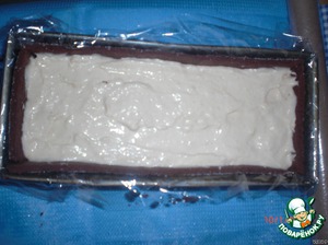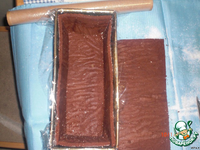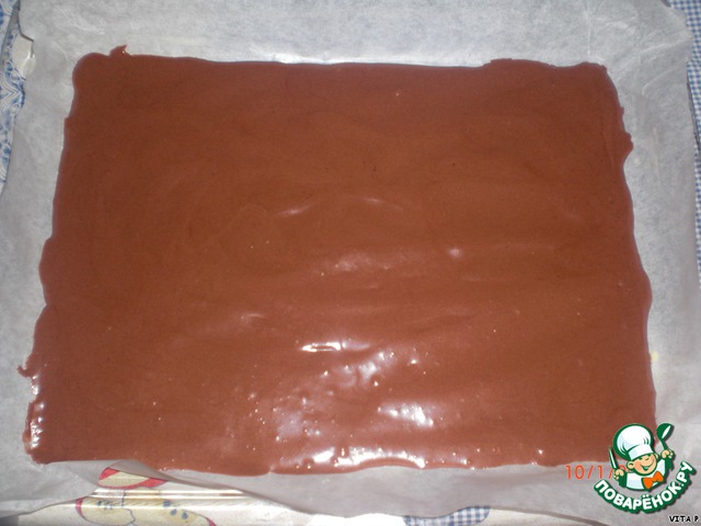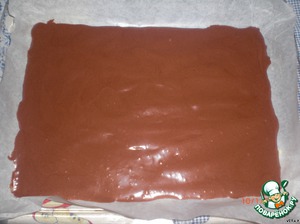 Тесто: 3 яйца взбить с 75 г. сахара в пенистую массу, добавить муку, какао и растопленное масло. Противень застелить промасленной бумагой и выложить равномерно тесто, выпекать 10-12 минут. -