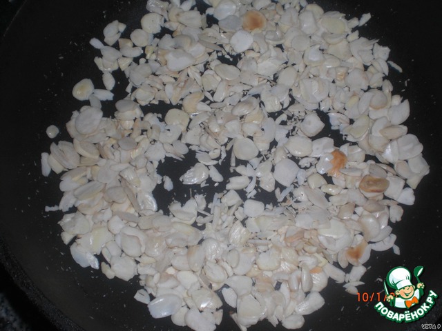 Мелко измельчённый на пластинки миндаль поджарить на сковороде.