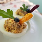 Желток смешать с паштетом и маслом, посолить, заправить горчицей и черным перцем. Полученным фаршем наполнить половинки яйца залить разбавленным и по желанию различно окрашенным майонезом (красным — добавив сок красной свеклы, или зеленым — добавив сок сырого шпината).