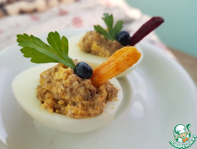 из каждой половинки яйца вынуть желток и срезать часть белка так, чтобы устойчиво поместить ее на тарелке.