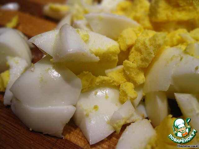 Варим яйца вкрутую, чистим их и режем такими же большими кусочками.