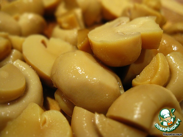 Открываем баночку маринованных шампиньонов и разрезаем каждый грибочек пополам.