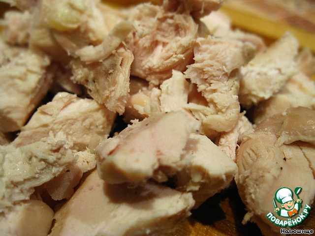 Отвариваем куриную грудку. Режем ее крупными ломтиками.